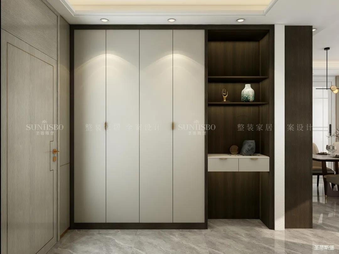 次卧床头是现代感十足的格栅设计,简约精致又颇具深度朦胧感。竖条纹的格栅还能起到拉伸视觉的作用,主观上提高了空间的开阔感。定制衣柜则根据空间整体的简约调性,将开放式与隐蔽收纳五五分,散发出高贵沉稳的优雅气质,和生活品味形成了恰到好处的平衡。